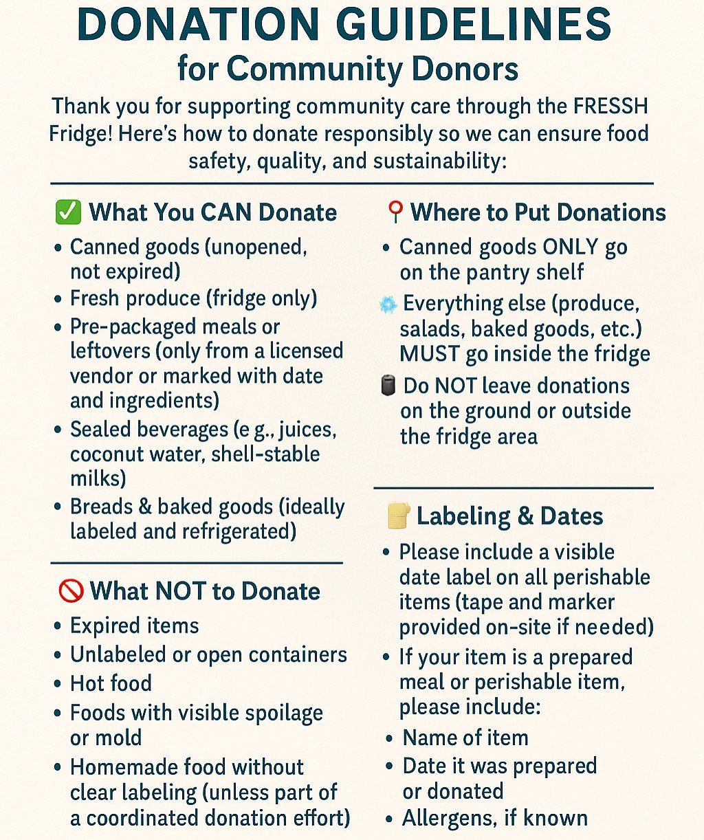 Donate: Visit the fridge & pantry to donate food and other items using the donation guidelines OR make a monetary contribution to sustain the efforts of keeping the fridge and pantry stocked!