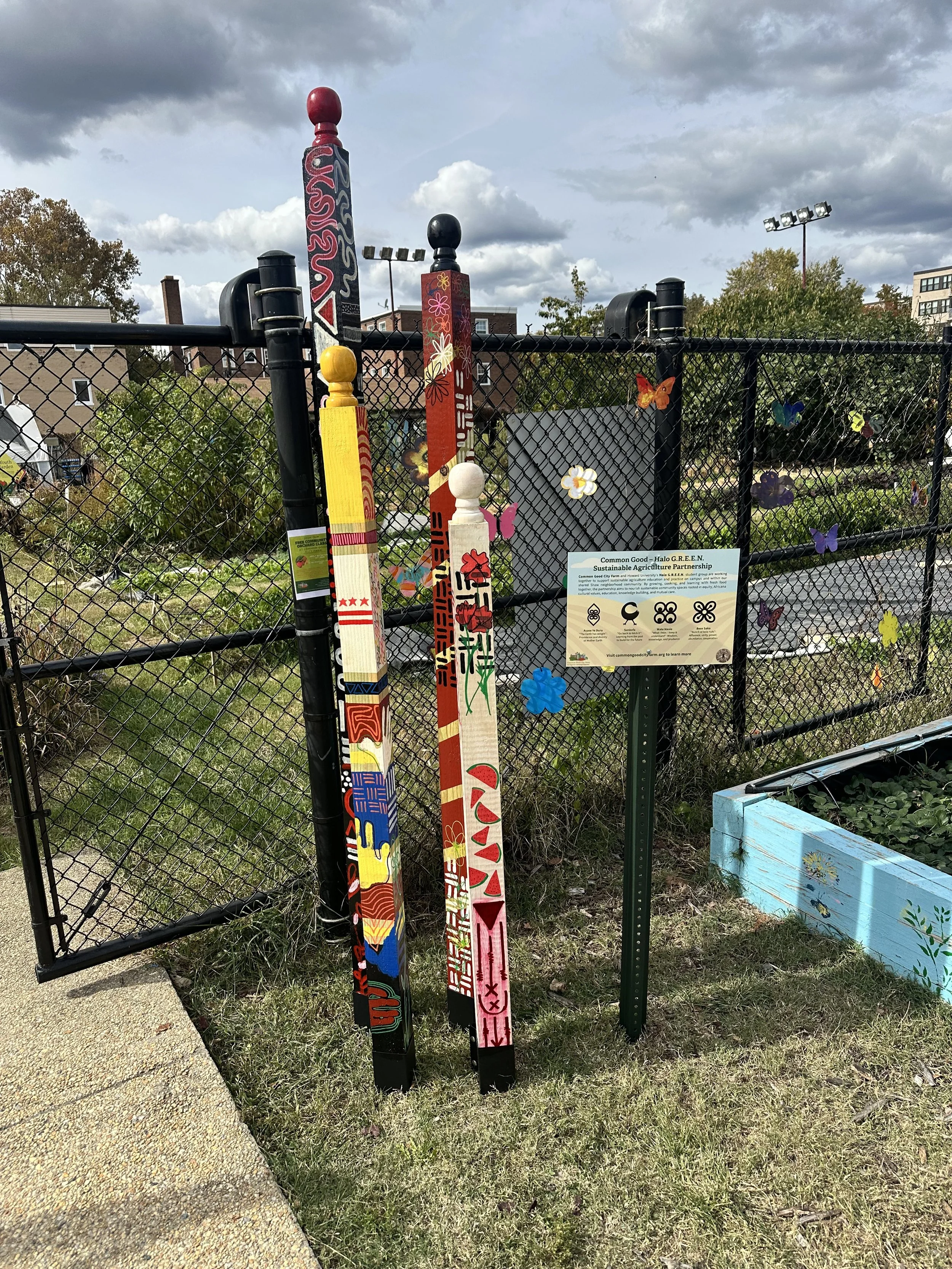 As a physical of a physical marker of this mutually beneficial partnership, there are garden totems standing at both Halo Green and Common Good City Farm (a total of 7). Each is designed through cultural and Indigenous influences that reflect unity, balance, abundance, education, and regeneration. They connect the student learning space to the community farming space down the road, as mycorrhizal networks connect plant and microbial life across forests; a living web of mutual support. The totems will remain as markers — to be maintained and revisited by future cohorts.